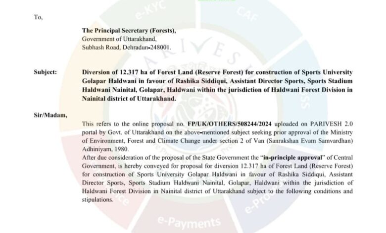 केंद्र सरकार के पर्यावरण, वन एवं जलवायु परिवर्तन मंत्रालय ने स्पोर्ट्स यूनिवर्सिटी बनाने के लिए जमीन की उपलब्धता के बारे में उत्तराखंड सरकार के प्रस्ताव पर सैद्धांतिक सहमति प्रदान कर दी है। हल्द्वानी वन प्रभाग के अंतर्गत गोलापार स्थित 12.317 हेक्टेयर वन भूमि पर स्पोर्ट्स यूनिवर्सिटी का निर्माण होगा।