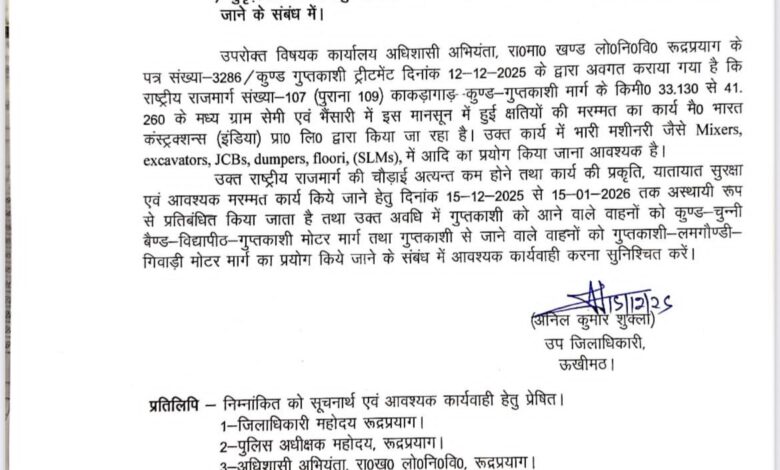 राष्ट्रीय राजमार्ग संख्या–107 (पुराना 109) के काकड़ागाड़–कुण्ड–गुप्तकाशी मार्ग पर मानसून के दौरान हुई क्षतियों की मरम्मत एवं सुदृढ़ीकरण कार्य के दृष्टिगत उक्त मार्ग को अस्थायी रूप से बंद किए जाने की अनुमति प्रदान की गई है। यह जानकारी उप जिलाधिकारी ऊखीमठ अनिल कुमार शुक्ला द्वारा दी गई।