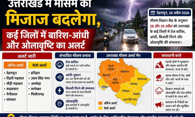 देहरादून, 28 अप्रैल 2026: मौसम विज्ञान केंद्र द्वारा जारी ताजा पूर्वानुमान के अनुसार उत्तराखंड में मौसम एक बार फिर करवट लेने वाला है। 28 और 29 अप्रैल को राज्य के कई जिलों में तेज बारिश, आंधी, बिजली गिरने और ओलावृष्टि की संभावना जताई गई है। इसके चलते कई जिलों में ऑरेंज और येलो अलर्ट जारी किया गया है।